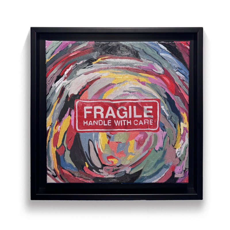 la composizione dinamica, con tonalità di rosso, giallo, viola e blu, evoca movimento e profondità, mentre il cartello rosso aggiunge un contrasto ironico, suggerendo la fragilità sottostante alla vitalità dell'opera.